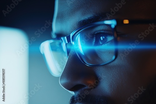 Close-up of an Individual Wearing Glasses, Focused Intently on a Screen With a Blue Light, Reflecting Concentration
