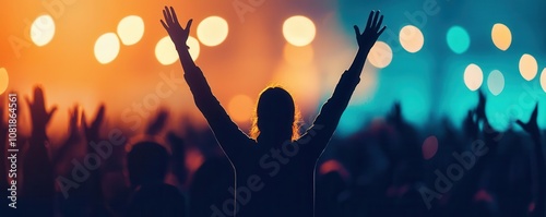 Person in the spotlight with hands raised in victory, crowd in the background applauding, joy and success filling the frame