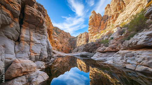 Malowniczy krajobraz skalny z cichym zbiornikiem wodnym, położonym u podnóża stromych klifów, pod krystalicznie czystym niebem.