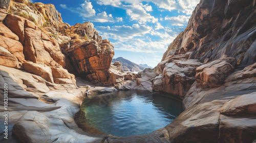 Malowniczy krajobraz skalny z cichym zbiornikiem wodnym, położonym u podnóża stromych klifów, pod krystalicznie czystym niebem.