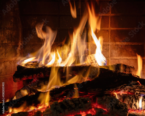 Fireplace burning, wood logs and bright flames. Warm home, heat. Christmas holiday