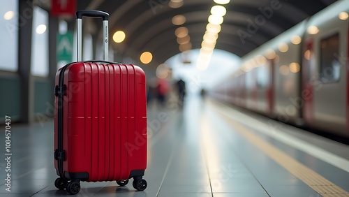 waiting for the train. Red suitcase standing in airport waiting room, background blurred, bokeh