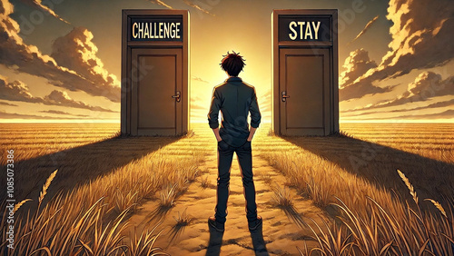 挑戦するか留まるかで悩んでいる男性のAI生成イラスト