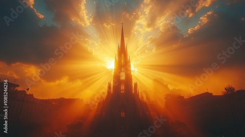 Majestic church silhouette at vibrant sunset, sun rays bursting through clouds.