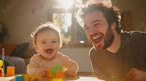 A young dad making a silly face as he hands his baby a wooden block, both laughing together in a sunlit living room with colorful toys scattered around.