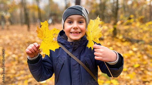 Jesienny portret chłopca, sześciolatek, brak mlecznych zębów, jesienny park, żółte liście. Uśmiechnięty chłopiec.