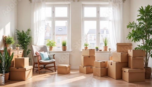 Bright Living Room Filled with Cardboard Moving Boxes and Indoor Plants