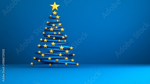Christmas tree with stars on it is displayed on a blue background. The tree is made of blue and gold material and has a star on top. The blue background gives the image a calm and peaceful mood