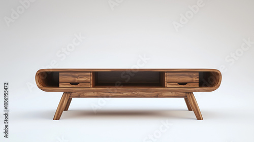 Nowoczesny stolik pod telewizor na białym tle, z praktycznymi przegródkami.