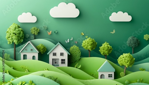 Green abstract wallpaper featuring houses and apartments, designed for a mortgage website, includes text area for information.