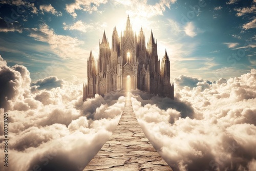 An imaginative illustration depicting the pathway to the heavenly kingdom among the clouds.