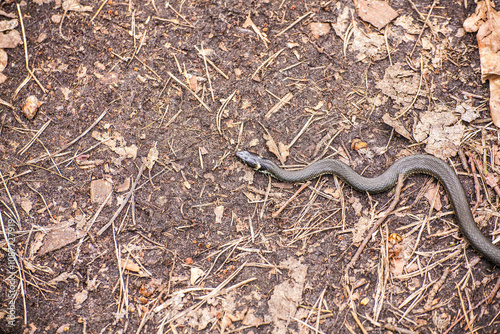 Zaskroniec pełzający po leśnym podłożu