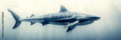 The silhouette of a shark seen from above, moving stealthily in clear, shallow water,