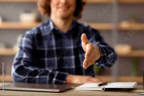 Employment. HR Manager Man Stretching Hand For Handshake Greeting To Camera Sitting At Desk In Modern Office. Job Interview, Agreement And Deal Concept. Selective Focus On Arm. Cropped