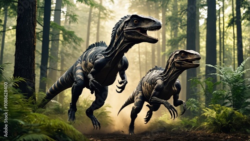 Dynamiczna scena przedstawiająca dwa welociraptory biegnące przez gęsty prehistoryczny las, otoczone paprociami i światłem słonecznym
