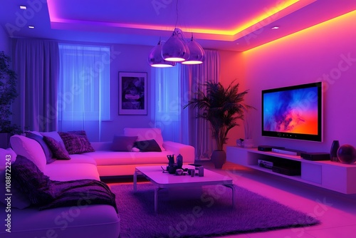 Modern living room with colorful LED lighting, sectional sofa, and large screen TV.