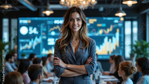 Pewna siebie liderka prezentująca pomysły w sali konferencyjnej. Za nią ekran z wykresami. Przykład przywództwa i innowacji.