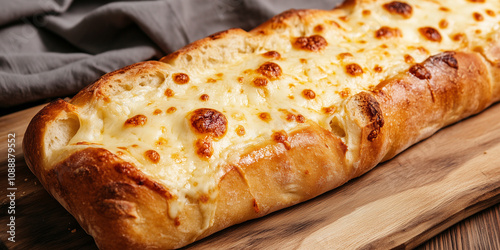 Świeżo upieczony chleb z nadzieniem serowym, z lekko zarumienionym wierzchem, emanuje zapachem.