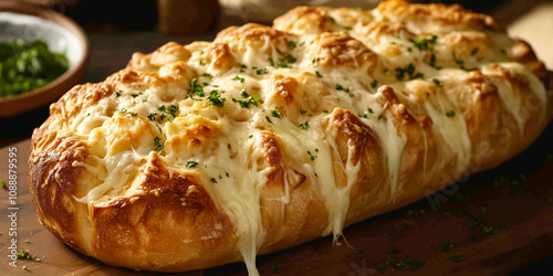 Świeżo upieczony chleb z nadzieniem serowym, z lekko zarumienionym wierzchem, emanuje zapachem.