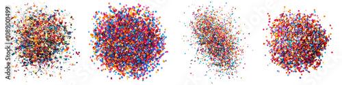 A vibrant arrangement of colorful particles forming distinct circular shapes that vary in density and hue.