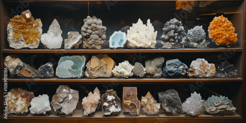 Wystawa minerałów i skał, eksponująca ich szczegółowe tekstury i różnorodność, ukazuje fascynujące bogactwo geologicznego świata w harmonijnym, uporządkowanym układzie.
