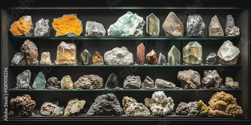 Wystawa minerałów i skał, eksponująca ich szczegółowe tekstury i różnorodność, ukazuje fascynujące bogactwo geologicznego świata w harmonijnym, uporządkowanym układzie.