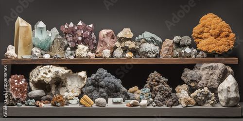Wystawa minerałów i skał, eksponująca ich szczegółowe tekstury i różnorodność, ukazuje fascynujące bogactwo geologicznego świata w harmonijnym, uporządkowanym układzie.