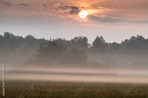 mgły nad polami i łąkami pod lasem wcześnie rano
