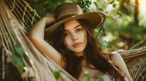 A young woman relaxing in a hammock surrounded by greenery, wearing a straw hat and enjoying a serene moment.