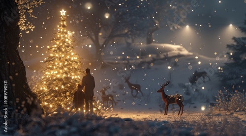 Christmas tree adorned with golden lights stands in a snowy forest. A family gathers around it, gazing at the glowing star atop the tree. against a night sky filled with stars. Lights and snow