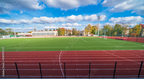 Widok na szkolny stadion sportowy - boisko piłkarskie i bieżnia - z trybun dla widzów Duże boisko otoczone bieżnią - stadion szkoły w mieście (Ostrowiec) w pięknym otoczeniu Polskiej Złotej Jesieni