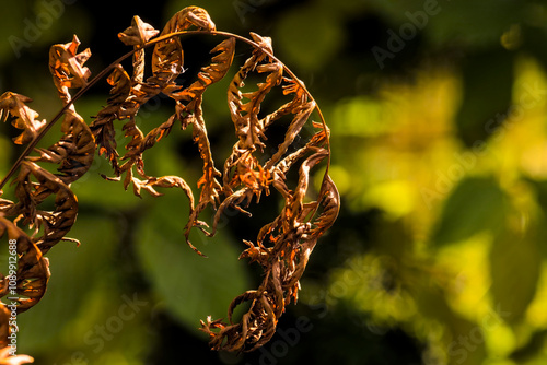 Znak jesieni - całkowicie wysuszony liść paproci na rozmytym tle. Suchy liść paproci w promieniach jesiennego słońca pod drzewami.