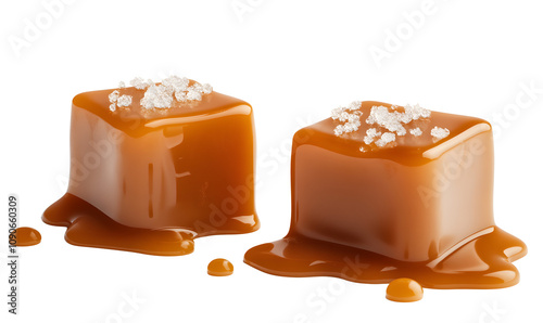 Two salty caramel candy cubes topped with caramel sauce and salt on white background