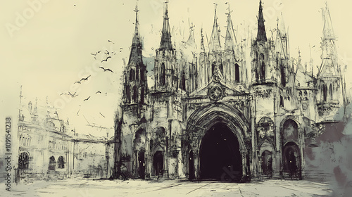 A detailed sketch of a gothic cathedral with multiple spires and a large central archway. Gothic Cathedral Spires. Illustration