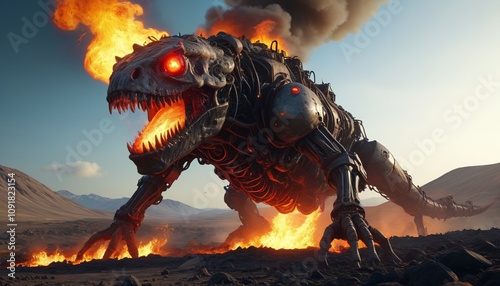 A giant steam-powered creature with glowing red eyes and a flame-throwing mouth, traversing a scorched landscape, Generative AI