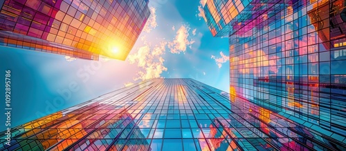 A colorful sky with clouds and reflections of the sun on modern glass skyscrapers in a wide angle.