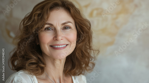 Kobieta w średnim wieku z promiennym uśmiechem i pewnością siebie pozuje na miękkim tle, podkreślając swoją wewnętrzną harmonię i doświadczenie życiowe.