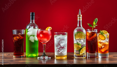 Different alcohol drinks on wooden table against red background. Space for text isolated with white highlights, png