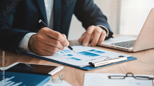 Businessman Analyzing Financial Data and Charts on Clipboard
