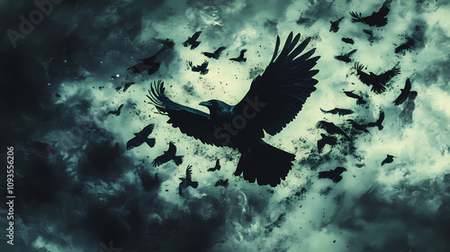 Ethereal silhouette dissolving into a murder of crows against a turbulent, stormy sky, evoking nightmarish horror and surreal imagery in conceptual art. Haunting Crow Silhouette. Illustration