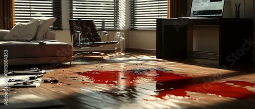 A meticulously staged crime scene in a modern city apartment. Bloodstains splattered on the polished wooden floor. Multiple pieces of evidence. An atmosphere that conveys tension and mystery.