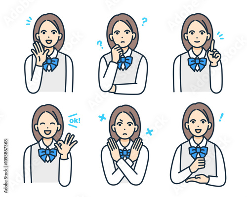 いろんなポージングの学生。かわいい女の子の表情セット。