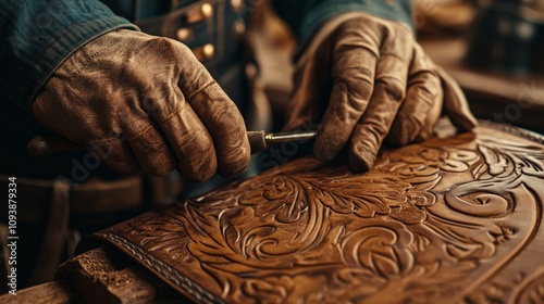 A leather crafter embossing a custom design onto a belt, using traditional tools to create intricate patterns.