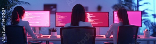 Three professionals focus on coding at modern workstations with colorful screens in an innovative office environment.