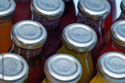 Szklane butelki z sokami owocowymi z nadrukowanym terminem ważności z bliska, dużo sztuk