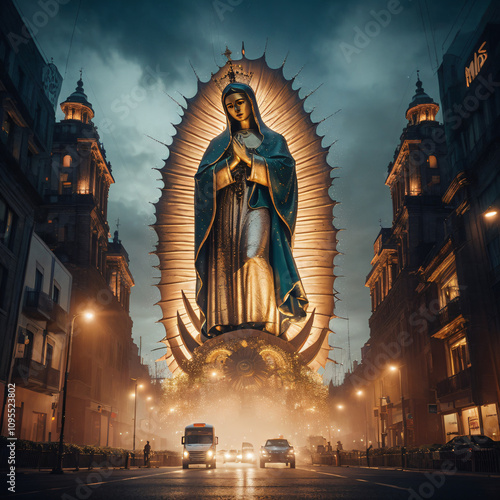 Figura de virgen gigante moviéndose por la ciudad en una tarde nublada.