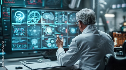 Scientist Engaged in Analyzing Brain Data on Multiple Screens in Advanced Laboratory