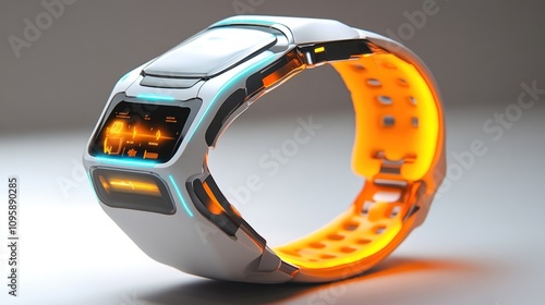A futuristic smartwatch with a sleek design and bright orange accents.