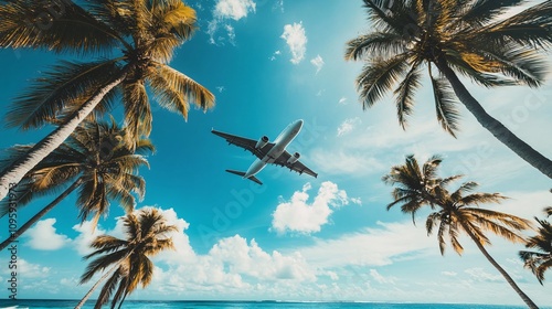 32.A clear blue sky with fluffy white clouds and tall, swaying coconut trees lining a pristine tropical beach. An airplane is seen soaring above, heading toward the glistening turquoise sea, evoking