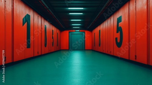 Red and Green Hallway with Numbers: A mysterious and captivating hallway with red walls and green floor, adorned with bold black numbers.
